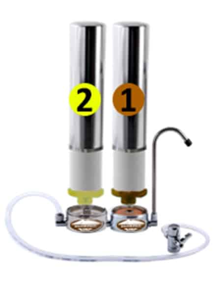 Στην αρχή τοποθετήστε μόνο την πρώτη φύσιγγα (καφέ) στη βάση της συσκευής, βιδώστε όλα τα μεταλλικά καπάκια (1) και αφήστε το φίλτρο να τρέξει για ένα λεπτό, ώστε να μην λερωθεί η δεύτερη κεραμική φύσιγγα από το ξέπλυμα της πρώτης φύσιγγας ενεργού άνθρακα (καφέ), που στην αρχή ίσως βγάλει λίγο μαύρο νερό.
